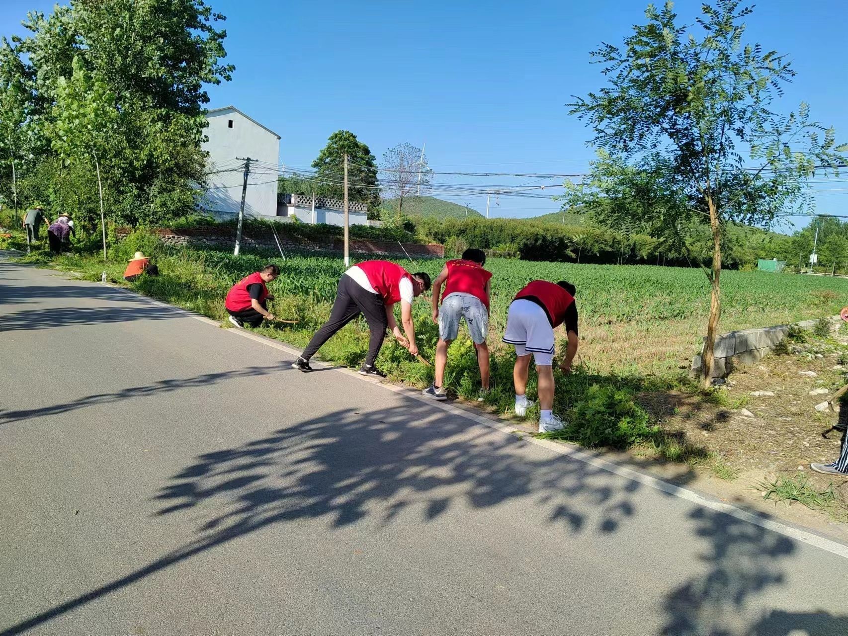 志愿者们清理路边的垃圾杂草