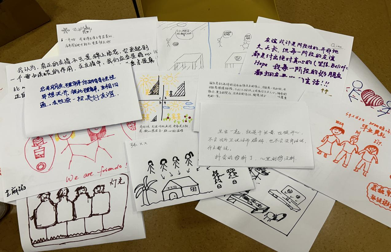 活动由“眼中的友谊”“身边的友谊”“心里的友谊”三部分组成。王文礼老师进行活动预热,明确本次活动开展的意义及重要性。随后,具体团辅指导由孟涵老师组织进行。第一个环节是“眼中的友谊”,孟涵老师通过一则电影短片与一份问卷调查对友谊展开深入探讨;“身边的友谊”环节中,由同学代表向大家分享自己的友谊故事,并共同开展“齐心协力凹姿势”“你画我猜接龙”游戏,阐释朋友之间也需要相互理解与支持,友谊更需双方彼此齐心协力、互相帮助的道理。最后一个环节中,孟涵老师通过列举实例向大家讲解不当处理友谊关系可能带来的危害,并布置了一个主题创作任务——用一段话或一幅画描述心中的友谊,以此加深各位对友谊的认知。能动24 级 9 班胡燃同学表示:“通过这次活动,我更加理解了什么是真正的友谊,并为未来正确处理友谊中的各种关系做好了充足准备。”