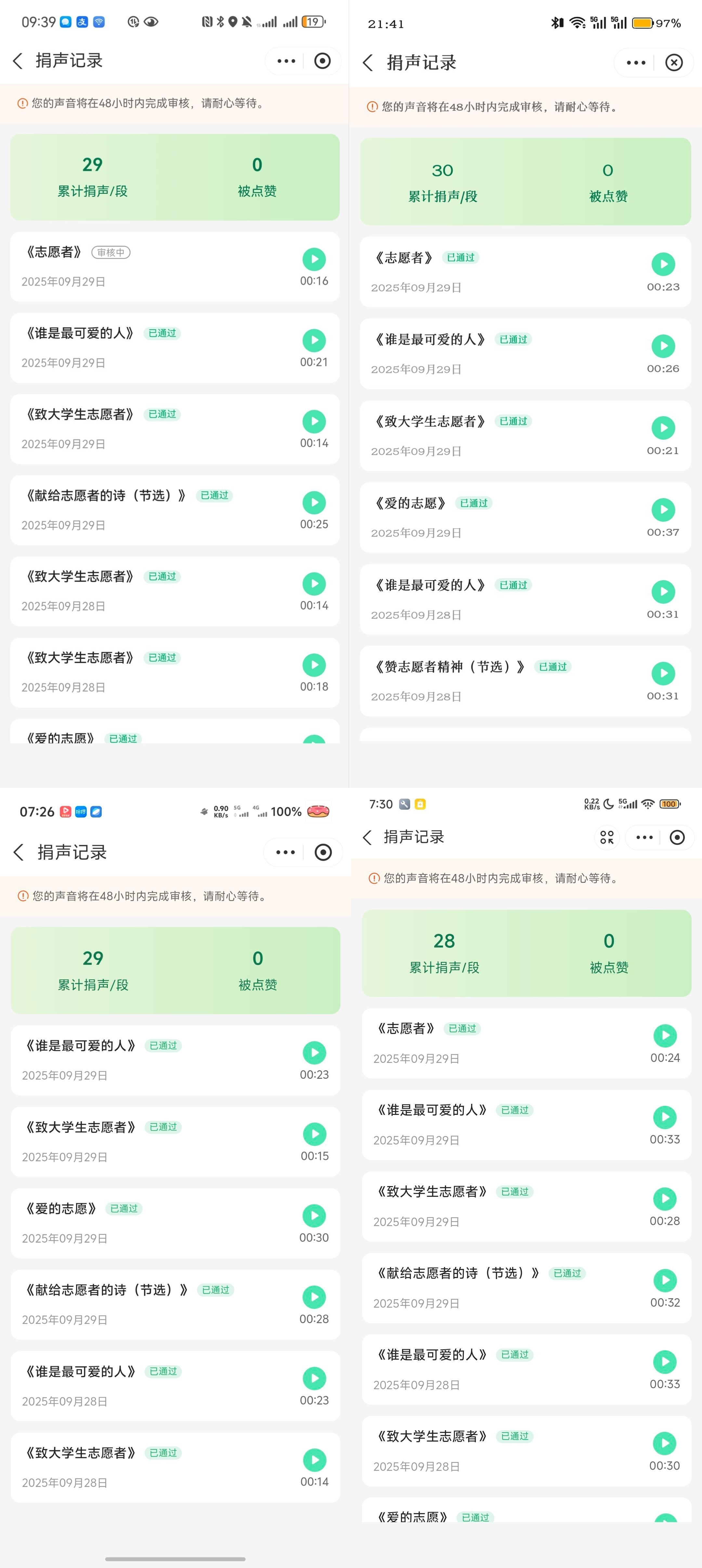 本次活动面向全校在校生,参与者需先完成登记报名,再每天通过“益起读”小程序按要求进行不少于四段的故事朗读,并将捐声记录截图上传至活动群进行打卡——这些声音将化作视障人士感知文字的“桥梁”,将声音化作触手可及的温暖,助力山区乡村小学读书角建设。活动结束后,工作人员审核参与同学的完成情况,并按每人完成情况给予相应志愿时长认证。参与活动的同学对此深有感触:“爱能超越一切感官局限。虽然上天剥夺了他们可见的光明,但我们还可以用声音指引他们前行。”