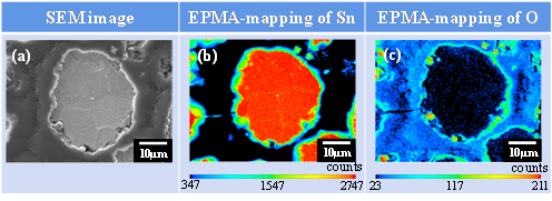Fig. 3 Cross-sectional SEM image and EPMA Sn/O element distribution images for water-20 after 100 cycles.