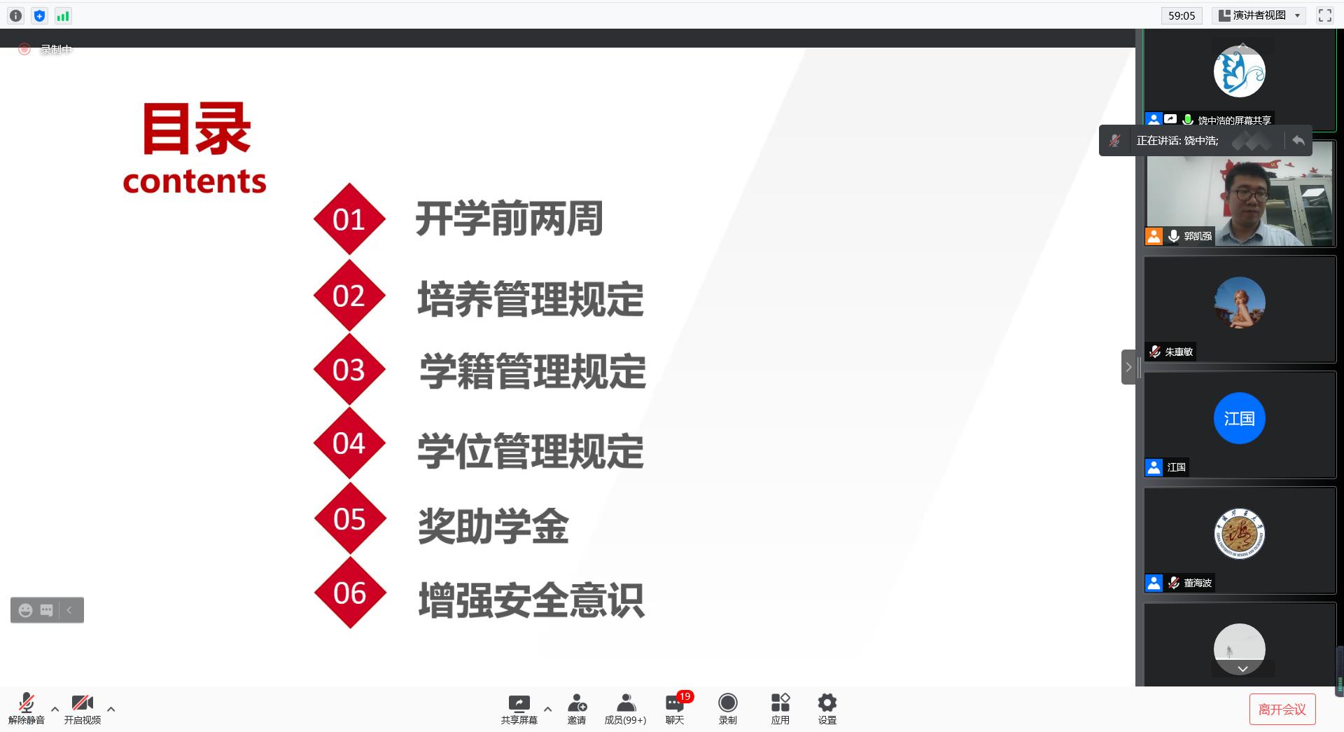 的相关政策、制度和规范,详细介绍了与研究生日常学习和生活密切相关的开学前两周工作、学籍管理规定、培养管理规定、学位管理规定、各项奖助政策及增强安全意识方面的相关内容,勉励研究生新生尽快适应环境,转变角色,找准定位,以最佳状态投入到新的学习和生活中,圆满完成研究生期间的学习和科研任务,在学习和探索新知的新征程上创造出更大的价值。最后,饶院长对全体新生送出身体健康,学业有成和家庭幸福的祝福。