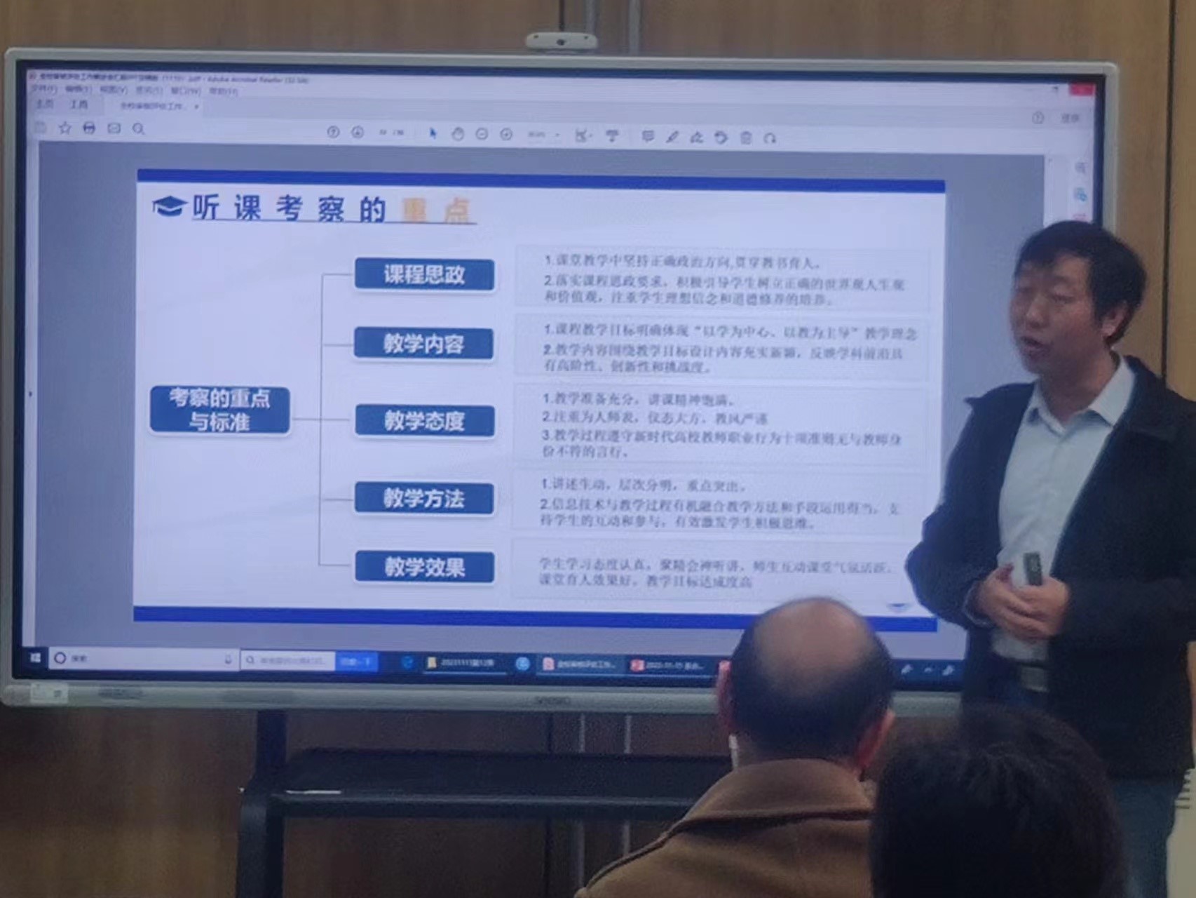 会议第三部分,王利军副院长布置国家本科教育教学审核评估线上线下评估工作。首先,强调了本科教学档案规范情况,整理了2023年度本科教学档案所存在的问题,且重点对常见的教学和试卷批改问题进行讲解和分析,总结如下改进思路。然后,重点布置了本科教育教学审核评估线上线下评估工作,要求大家理解审核评估要义,熟悉本科教育教学,迎接专家评估考察,以评促建促改促强。特别是强调了本轮审核评估的新变化,并在课程思政、教学内容、教学态度、教学方法和教学效果方面,给出考察的重点与标准。