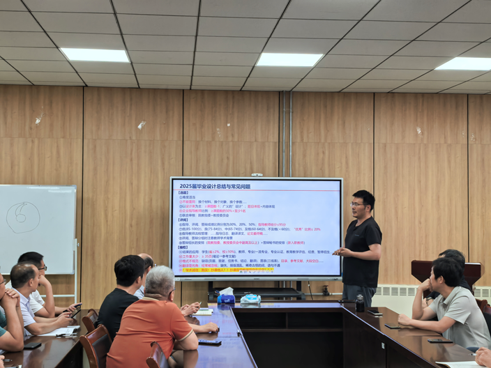 会议第一部分,周忠宁老师从选题、评阅、抽检等方面详细分析了2025届毕业设计的常见问题,并针对性说明了相关文件要求。与会老师针对企业导师署名、指导日志、毕设工作量等内容进行了讨论。接着,周忠宁老师介绍了认识实习、生产实习的学生组成情况,说明了实习安排要求,并针对上一年度学生实习反馈给出了针对性解决方案。