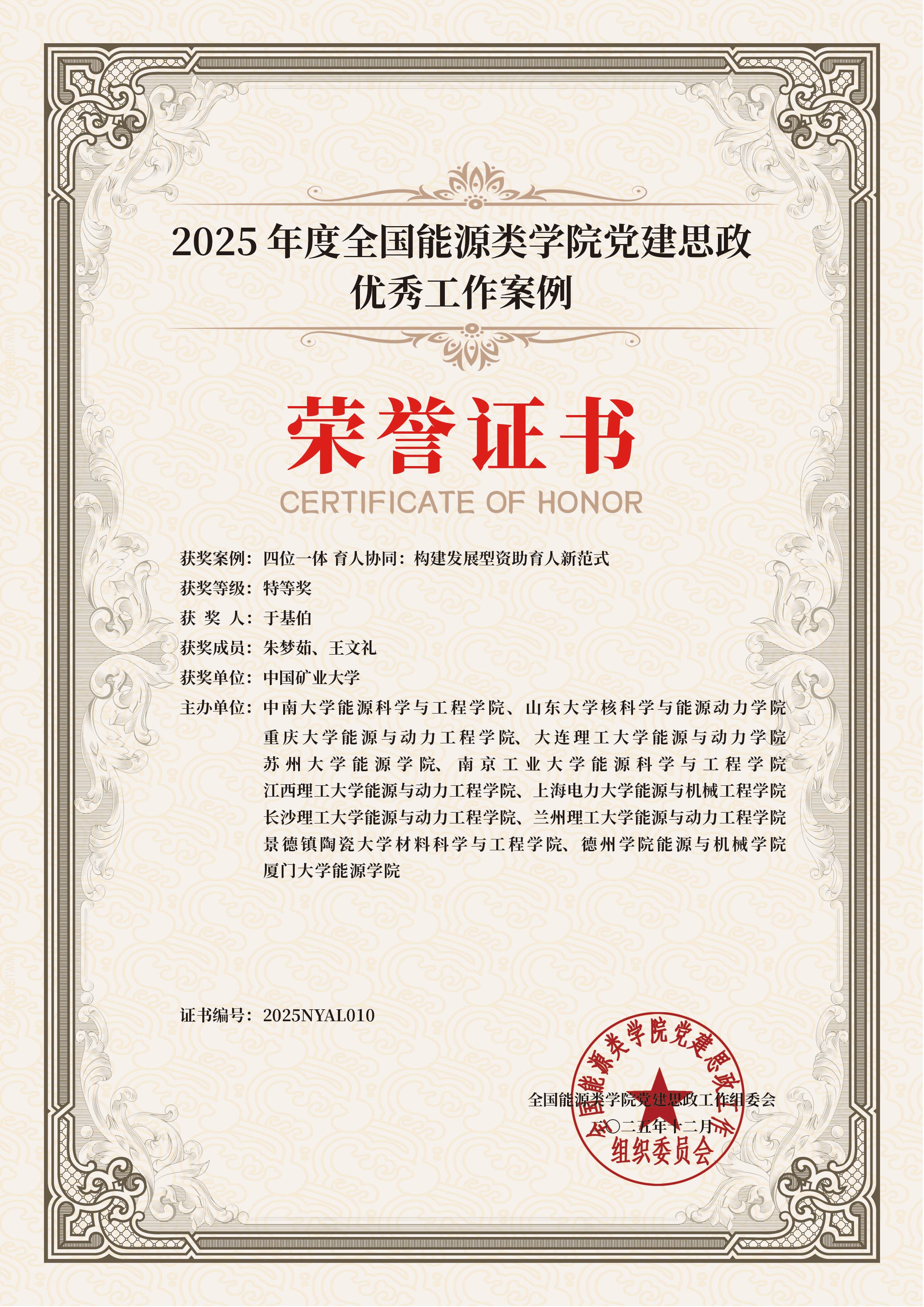 于基伯、朱梦茹、王文礼完成的案例《四位一体育人协同:构建发展型资助育人新范式》荣获特等奖(特等奖共10项)。