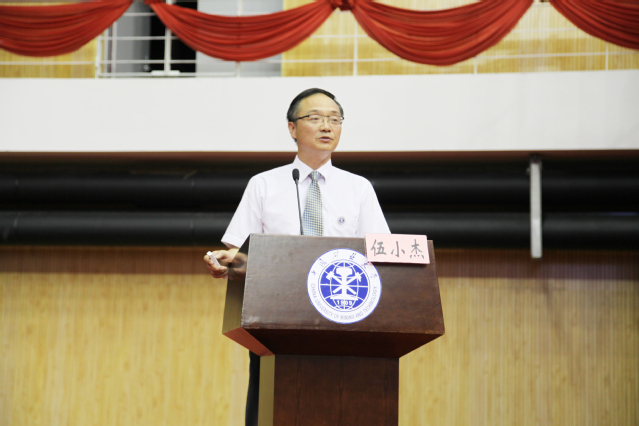 于南湖体育馆面向2018级新生开展校情校史教育活动。院党委书记伍小杰为2018级新生作报告。