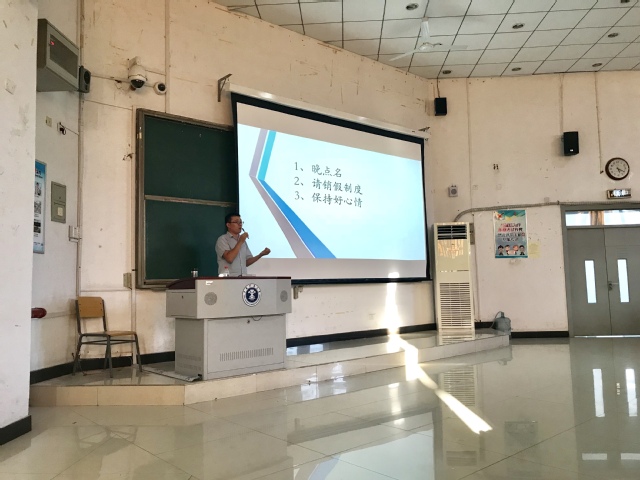 随后,郭凯强老师针对大四这一重要学年,在“生涯规划,该如何选择”的问题上,通过一些数据为同学们分享了2018届各专业的毕业去向,并就保研、工作、出国三个方面做了详细分析。他强调每个人的未来都会有很多可能性,要真正的做到自觉、自律。校园日常管理方面,为了提高同学们的安全意识,郭老师进一步就请销假制度、校园安全等情况进行了说明。郭老师也不忘叮嘱大家要珍惜友谊,学会感恩,尊重他人,保持好心情。最后,贾智麟老师表示同学们要尽快理清思绪,确定就业方向,抓住求职机遇。