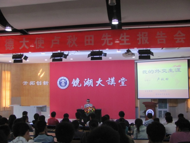 4月28日下午4时整,前驻德大使、中国人民外交学会会长卢秋田于我校镜湖大讲堂召开报告会。本次报告会由我校校团委、国际教育交流中心联合主办。